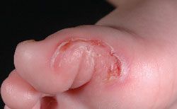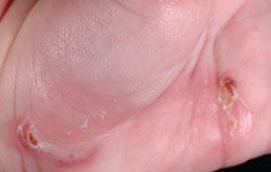 This child has epidermolysis bullosa simplex. Epidermolysis bullosa (EB) encompasses a large number of genetically transmitted skin disorders characterized by abnormalities in the structure of the epidermis, the dermis, or the dermoepidermal junction that result in blistering caused by mechanical friction. The clinical manifestations of these disorders vary from minor blisters to mutilating and even life-threatening blistering and scarring of the skin and other epithelial structures. In a newborn, it is often difficult to distinguish between the variants of EB without a skin biopsy; however, later in infancy, the clinical presentation is usually sufficient to enable a clinician to be comfortable with the diagnosis. Confirmation of the specific variant present in a particular patient requires that unique investigations be performed on the skin. I recommend that clinicians contact a pediatric dermatologist to determine who can perform these investigations.