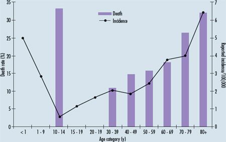 . Accessed July 13, 2010. Figure 2 – This graph shows both the annual incidence of and death rate for invasive group A streptococcal infection (IGASI) by age in Montreal between 1995 and 2001. Note that although the incidence of IGASI is lowest in children between the ages of 10 and 14 years, the death rate from IGASI is highest in that age-group.