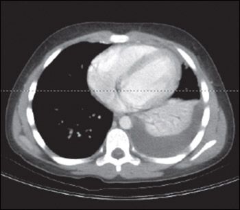 Figure 1 – This patient's chest CT scan showed a left-sided pleural effusion with consolidation. The cause of the pneumonia was invasive group A streptococcal infection.