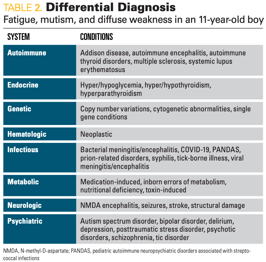 An 11-year-old boy with a history of asthma and allergic rhinitis presented to the emergency department (ED) with worsening fatigue, minimal responsivity to external stimuli, and diffuse muscle weakness for 2 months. He had been admitted the previous month at another hospital for weakness, weight loss, and odynophagia, where he was found to have an elevated creatinine kinase (CK) level of 800 U/L and was diagnosed with viral myositis. Results from an additional workup included the following: hemoglobin A1c level, 5.1%; COVID-19 polymerase chain reaction test, negative; COVID-19 IgG, negative; and rapid strep test, negative. He had an unremarkable esophagogastroduodenoscopy and colonoscopy, and an electroencephalogram (EEG) that did not demonstrate epileptiform seizures. He received IV fluids for dehydration and myositis. After discharge, his symptoms continued to progress with worsening muscle weakness, refusal to eat, and mutism.