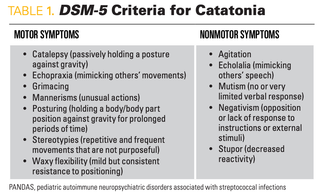 Catatonia is an often-underdiagnosed neuropsychiatric syndrome that can occur secondary to medical or psychiatric illnesses. It presents a unique diagnostic challenge due to its rarity, varied symptomatology, and comorbid or underlying conditions, particularly in pediatric patients. Diagnostic criteria per the Diagnostic and Statistical Manual of Mental Disorders, Fifth Edition require the presence of at least 3 stereotypical symptoms as found in Table 1.1