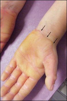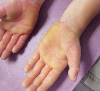 Each of these 3 types can be further described as epidermolytic or nonepidermolytic. In this patient, PPK manifested early in life-within the first 3 months postpartum-and was localized to the palmoplantar surfaces, with a defined border (arrows). His palms and soles did not have a waxy appearance; this finding distinguished his condition from nonepidermolytic PPK. In addition, the toenail involvement and history of secondary bacterial infection indicated that his condition was more diffuse. Thus, his PPK can be characterized as diffuse and epidermolytic.