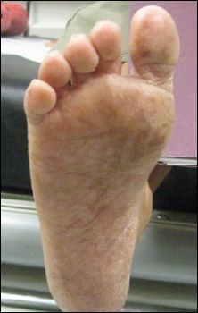 Examination of the skin revealed a raised clear line of demarcation between the unaffected skin of the ankles and wrists and the thickened, red skin on his palms and soles. The soles of his feet were characterized by itchy red papules; a scaly, thickened appearance; and several raw, deep fissures resulting from a recurrent pyogenic skin infection from which he had recently recovered after treatment with clindamycin. His toenails were slightly discolored and dystrophic, but he did not appear to have a fungal infection.