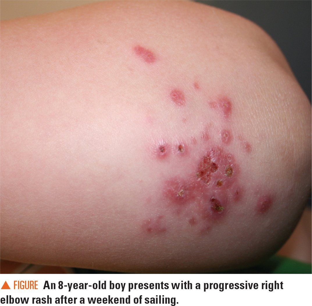 A previously healthy 8-year-old boy presents to the dermatology clinic with a progressively worsening elbow rash over the course of the last week. The rash does not itch. He spent the previous weekend sailing on the Chesapeake Bay. His pediatrician prescribed a course of cephalexin as well as a trial of topical antiviral ointment, neither of which improved the rash. The patient denies any other new exposures.