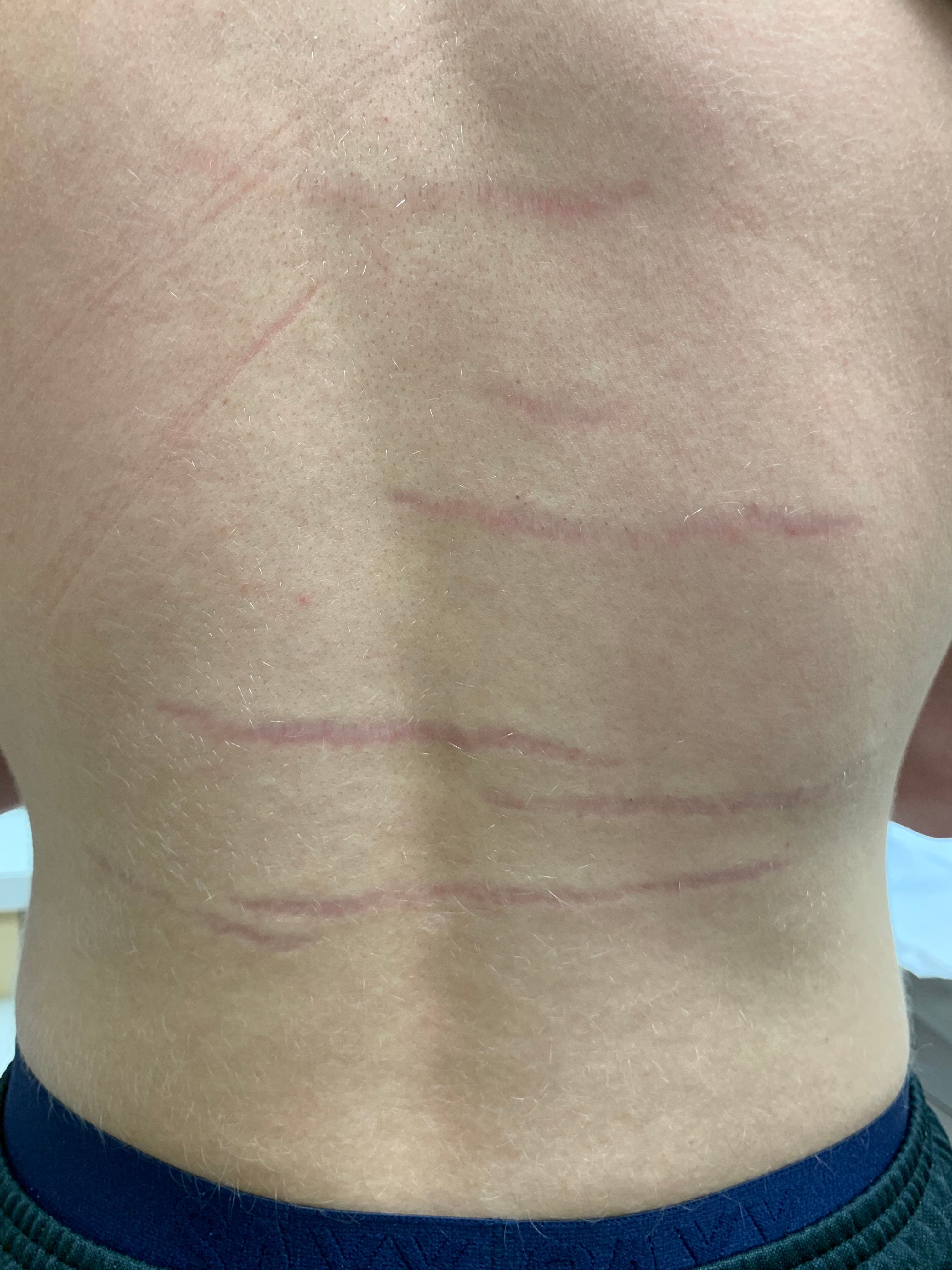 You are asked to evaluate a healthy 15-year-old boy with transverse bruise-like marks on his back (Figure 1).