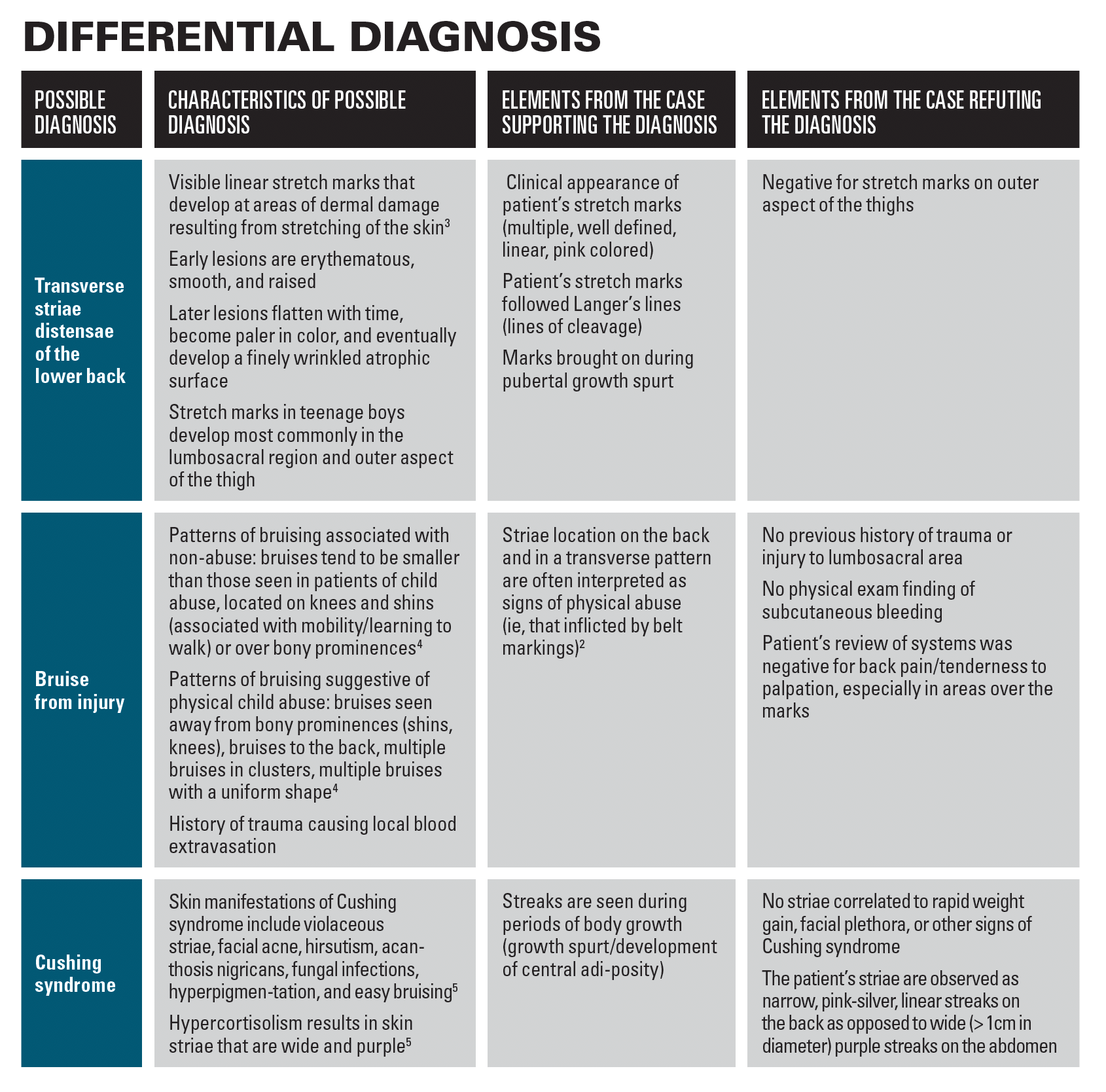 The differential diagnosis includes striae distensae in addition to bruising from skin injury. There are various triggers for striae distensae including both topical and oral steroid usage, obesity, excessive marijuana use, and rapid weight gain or loss.1 Another less common cause of striae in adolescents is Cushing syndrome, which is often associated with metabolic weight gain, high blood pressure, and Cushingoid facies.2
