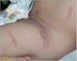 The child appeared well-nourished and had normal vital signs. She cried during attempts to examine her groin, which showed a 10 × 6-cm area of redness, induration, and tenderness with hyperpigmentation. A central 1 × 1-cm clear fluid-filled bullous lesion was also noted (Figure 1). Skin folds were spared. The child also had scratch marks on her left thigh. There was an old patterned burn mark on the left thigh and flank. The mother reported that the burn had been sustained 4 months earlier when the child fell onto an electric heater (Figure 2). The mother had not brought her daughter for medical attention at that time. There was no inguinal lymphadenopathy.