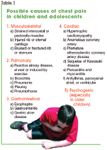 In our very cardiac-conscious society, a child presenting with chest pain usually creates anxiety in his or her parents, who fear for the worst. Despite the family's worries, which can be considerable, the many causes of chest pain are usually benign. In rare cases, however, it can be the harbinger of significant cardiac disease. Pediatricians should therefore complete a preliminary evaluation for chest pain, decide on a differential diagnosis, and if not make a specific diagnosis, at least develop a diagnostic plan to learn its cause. Often a definite diagnosis calls for the aid of an appropriate consultation. With this assistance, a treatment plan can be established.