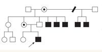 Figure 3 shows this patient’s maternal male relatives, with coarsened facial appearance and skeletal changes that have been likened to those of gargoyle statues. The pedigree provides strong evidence of X-linked recessive inheritance by male-only affliction, lack of male-to-male transmission, and linkage of affected males through females (female carriers) (see Figure 2). The 2 X chromosomes in females allow them to “carry” an abnormal allele on 1 X chromosome that is compensated for by a normal allele on the companion X. In future pregnancies, carrier females have a 1:2 or 50% risk that any son will be affected with Hunter syndrome and a 1:2 or 50% risk that any daughter will be a carrier.