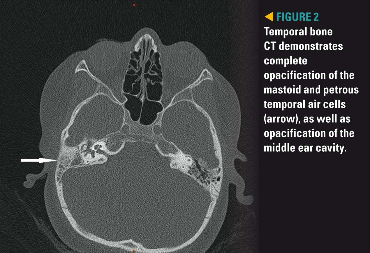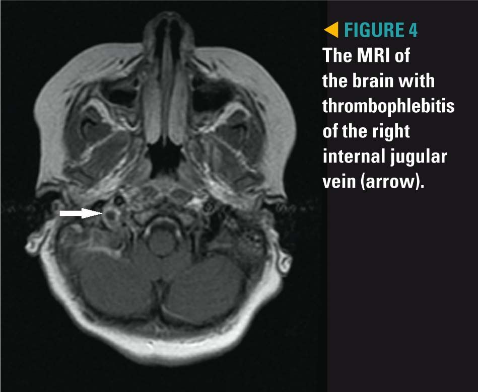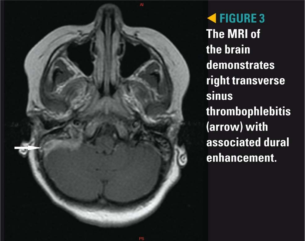 Because of intermittent low-grade fevers (100.4°F to 101.8°F) for 5 days despite drainage of the right ankle and foot abscesses, wide-spectrum IV antibiotics, and persistent pain of right ear and neck, a computed tomography (CT)scan of the temporal bones and an MRI of the brain and neck were obtained. The CT showed right otomastoiditis (Figure 2) and thrombophlebitis of the right sigmoid sinus, jugular vein, and transverse sinus (Figures 3 and 4). Otolaryngology took the patient to the operating room for a right myringotomy with pressure equalization tube placement, right mastoidectomy, and facial nerve monitoring. To decrease the risk of idiopathic intracranial hypertension resulting from cerebral venous thrombosis, Hematology recommended starting enoxaparin.