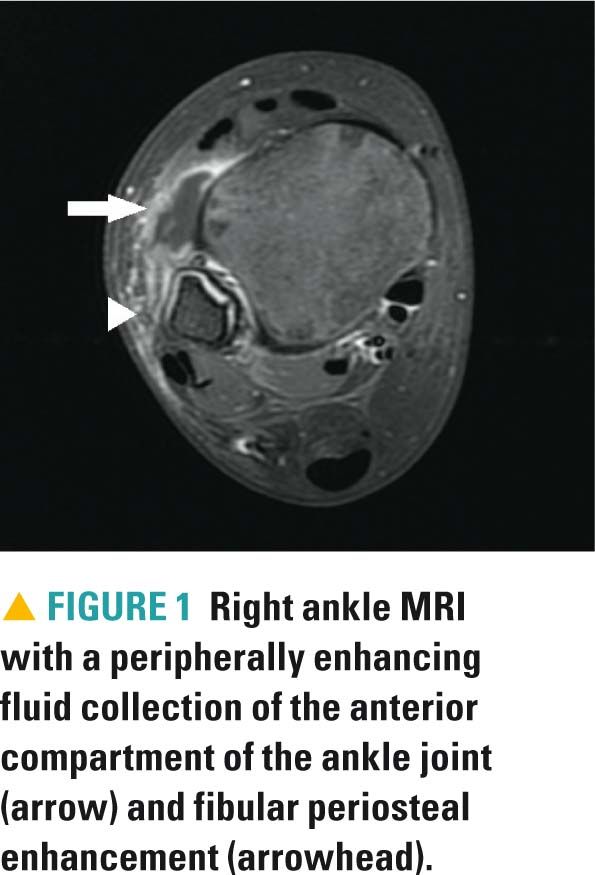 Because her right foot/ankle was the site of the most pain, and because she had fever, the patient underwent a right ankle MRI with and without contrast. It showed fluid collections in the anterior ankle compartment and flexor digitorum muscle, which were concerning for abscesses due to hematogenous spread (Figure1). The patient was taken to the operating room where the 2 abscesses were drained. The wound culture grew many group A beta-hemolytic strep. To assist with antibiotic choice and duration of therapy, Infectious Diseases was consulted. Her antibiotics were switched from IV cefepime and vancomycin to ampicillin/sulbactam.