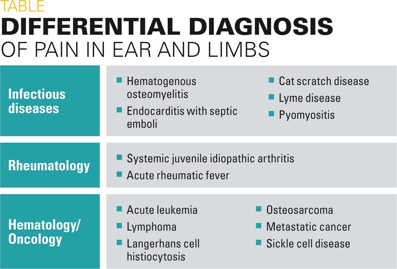 The anemia, hypoalbuminemia, and elevated inflammatory markers suggested the patient had a significant inflammatory process. The differential diagnosis of fever and extremity pain is fairly extensive (Table). Hematogenous osteomyelitis, leukemia, and endocarditis with septic emboli to the extremities were strongly considered in this order.