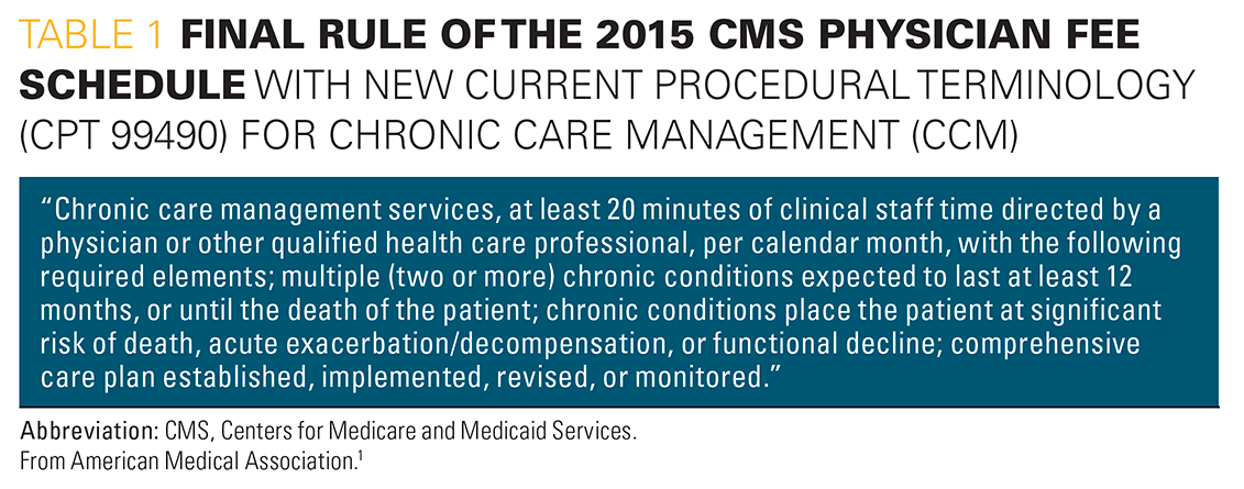 The Final Rule of the 2015 CMS Physician Fee Schedule included the new Current Procedural Terminology (CPT 99490) and is defined as (Table 1).1