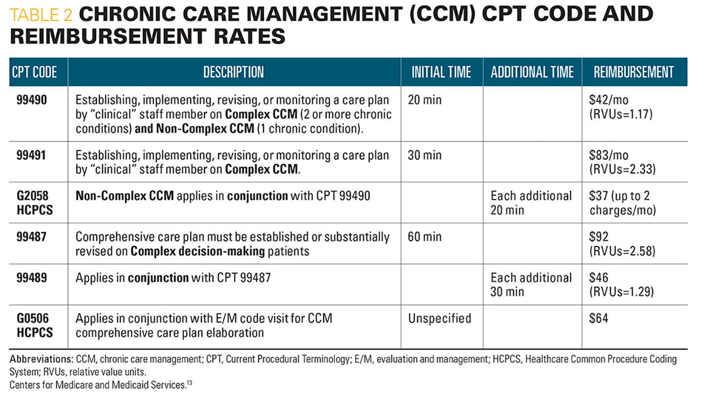 The current Medicare Physician Fee Schedule (MPFS) conversion factor is $36.0391 per relative value unit. Applying the national average MPFS values (actual payment varies by geographic location), payment for CCM services ranges from $42.17 for code 99490 to $92.98 for code 99487 (Table 2).11 A noteworthy example is that if 100 patients are enrolled to CCM services, an additional amount of $42,000 a year will be generated. Per CMS rules, billing practitioners cannot submit code 99491 in the same calendar month as CPT codes 99487, 99489, or 99490.