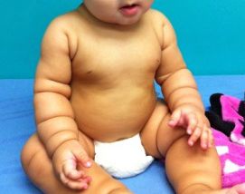 A 9-month-old girl presented for a well-child check. She was in the 75th percentile for weight and 50th percentile for length. She had excessive skin folds over her arms and legs and bilateral epicanthic folds. She was developmentally appropriate and had no other congenital anomalies. The rest of the physical examination findings were normal.
