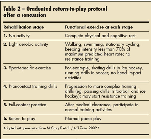 The most recent recommendation about returning to play after a concussion for children and adolescents is that the process needs to be individualized and stepwise.2 Generally, each stage in concussion rehabilitation should last no less than 24 hours, so that a minimum of 5 days passes before a full return to competition (Table 2). The first step includes complete physical rest-no sports, physical training, gym class, or recreational activities (such as bike riding) that place the patient at risk for recurrent head trauma-and cognitive rest-no school or decreased school load as well as limiting activities at home, such as computer use and video games, that require attention or concentration. Ensuring that injured athletes comply with this first step requires a team effort by the pediatrician, parents, and education professionals.