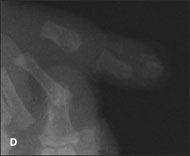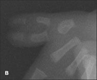 Complete duplication of the left thumb in a baby boy was noted at birth; a radiograph of the thumb showed 2 proximal and distal phalanges with 1 first metacarpal bone (A and B). He also had fusion and incomplete bony duplication of the right thumb; a radiograph of this digit showed normal proximal and distal phalanges plus a small tiny bony remnant of the proximal and distal phalanges of an accessory thumb (C and D).