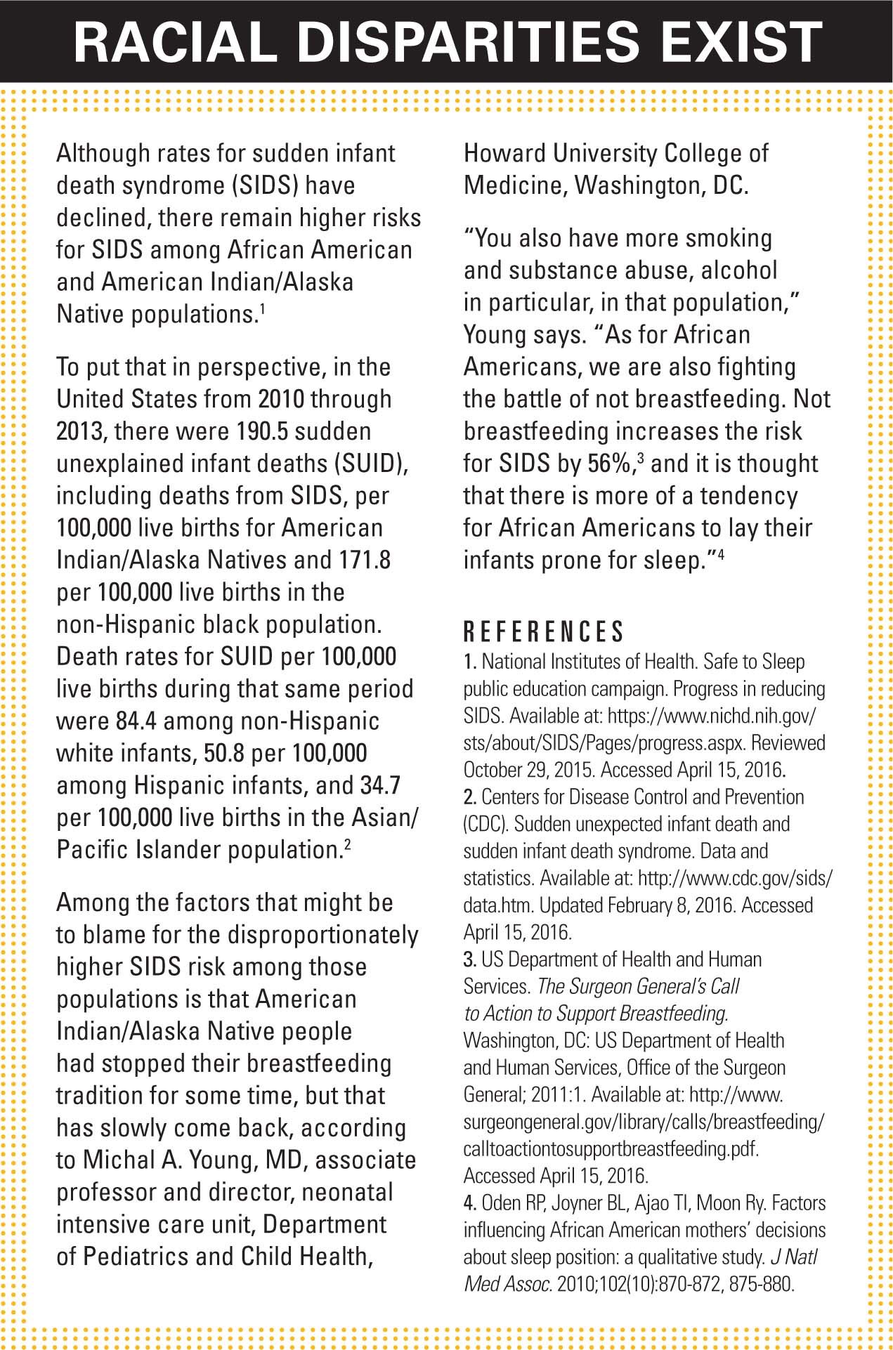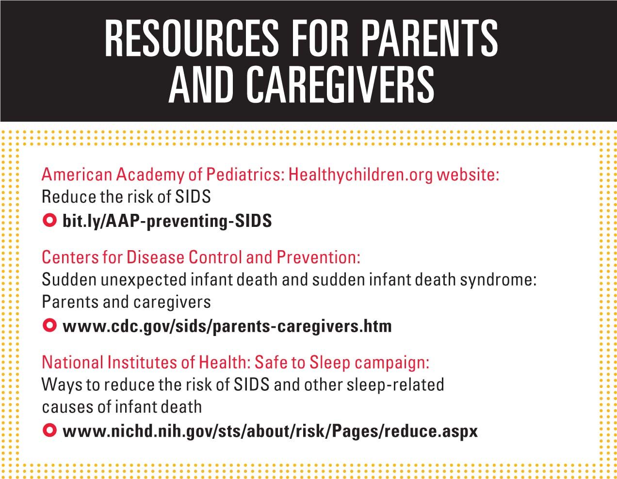 10. Centers for Disease Control and Prevention. Sudden unexpected infant death and sudden infant death syndrome. Parents and caregivers. Available at: http://www.cdc.gov/sids/parents-caregivers.htm. Updated September 28, 2015. Accessed April 15, 2016.
