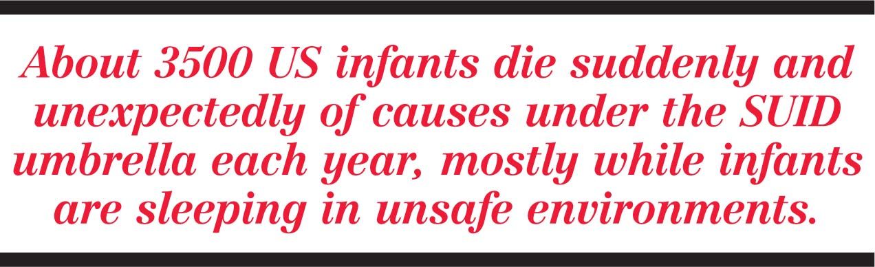 About 3500 US infants die suddenly and unexpectedly of causes under the SUID umbrella each year. Although many of the causes of death can’t be explained, most occur while infants are sleeping in unsafe sleeping environments.7
