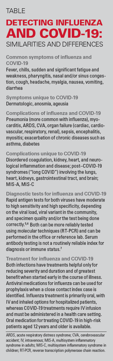 As we became obsessively careful with sanitizers, masks, social distancing, and quarantines, we came to recognize that COVID-19 is very different from influenza. COVID-19 is more contagious and more significant in short- and long-term morbidity yet more variable in its manifestation from asymptomatic to rapidly fatal. Symptoms can be nearly identical and only testing can differentiate, but the overlap seems to stop there, with COVID-19 adding a more diverse menu of symptoms and complications. The Table lists some similarities and differences in symptoms, complications, and the diagnosis and treatment of influenza and COVID-19.