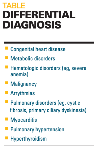 For this patient’s respiratory symptoms and failure to gain weight appropriately, differential diagnosis includes cardiac (congenital heart defect, arrythmia, myocarditis, pulmonary hypertension), inborn error of metabolism, hyperthyroidism, hematologic (such as severe anemia), neoplasm, and pulmonary (such as cystic fibrosis and primary ciliary dyskinesia). Her lack of growth is suggestive of an underlying disease process. When coupled with her exam findings consistent with heart failure, the diagnosis of congenital heart disease becomes the most likely. Inborn error of metabolism is possible but less likely given normal basic metabolic panel. Myocarditis secondary to illness as cause of heart failure should be considered.