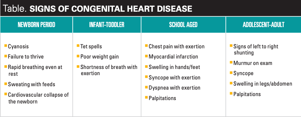 Congenital heart disease impacts approximately 8 in 1000 live births with about one-third of these babies requiring intervention by catheterization or surgery within the first year of life. The critical congenital heart disease (CCHD) screen performed prior to discharge from the hospital of newborns in all 50 states has resulted in a 33% decrease in early infant death from critical congenital heart disease.5 However, the sensitivity of CCHD screening is estimated to be only 50% to 76% and there are multiple conditions that are not picked up by this screening.6,7 The pediatric health care provider must carefully watch for the develop of symptoms in their patients that would indicate the presence of congenital heart disease (Table).
