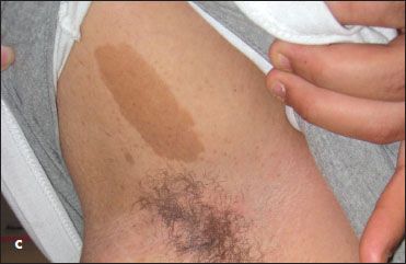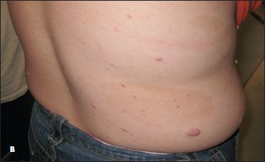 During the physical examination, the patient was noted to have 8 hyperpigmented macules ranging from 2 to 8 cm with smooth margins, 7 or 8 flesh-colored, nontender papules, and 3 nodules on the trunk (A). His mother had numerous similar lesions on her trunk (B). Neither son nor mother had any changes in vision, heart murmur, or bony deformity. A diagnosis of neurofibromatosis had been suspected by a previous physician but had not been confirmed.