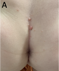 A 21-month-old girl presented with a history of "skin tags" involving her gluteal cleft,noted at birth (Figure 1A). She was otherwise healthy and developing normally. Notably, her older sister had a confirmed history of molluscum contagiosum (MC).