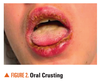 EM typically presents as erythematous target lesions and papules that may be pruritic or burn. The target lesions classically feature 3 concentric segments with a dark center surrounded by a lighter pink ring, then a darker red ring. Atypical lesions, with only 2 concentric rings, also are often present. Lesions may evolve over several days to become bullous. The lesions typically begin bilaterally on the extensor surfaces of the extremities and then spread proximally to the trunk. The lesions tend to be fewer on the trunk and face and have a predilection for areas of sunburn and physical trauma.2 Mucosal involvement features erosions on the lips, tongue, buccal mucosa, and, less commonly, the genital and ocular mucosa.1 Although the acute disease is usually self-limiting, it can also be recurrent or persistent in a small proportion of patients. Recurrent pediatric EM occurs more frequently in older children and male patients, with herpes simplex virus (HSV) being the most common trigger.3