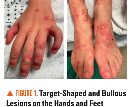 Infectious agents or medications most often trigger EM. The most common infectious triggers are HSV and Mycoplasma pneumoniae, although other infections, including Epstein-Barr virus, varicella-zoster virus, group A Streptococcus, adenovirus, cytomegalovirus, Chlamydophila pneumoniae, and COVID-19, have been reported. Drug triggers, including antibiotics, anticonvulsants, and nonsteroidal anti-inflammatory drugs, also have been implicated. Finally, a small percentage of patients developed EM after vaccine administration, including the diphtheria-tetanus-pertussis vaccine, recombinant hepatitis B vaccine, and the COVID-19 vaccine. EM is also idiopathic in many cases, although some cases with no identified trigger may be due to subclinical infection.3 If the trigger is not suspected, obtaining herpes simplex polymerase chain reaction test results from blisters and/or mucous membranes can rule out the most identified trigger.