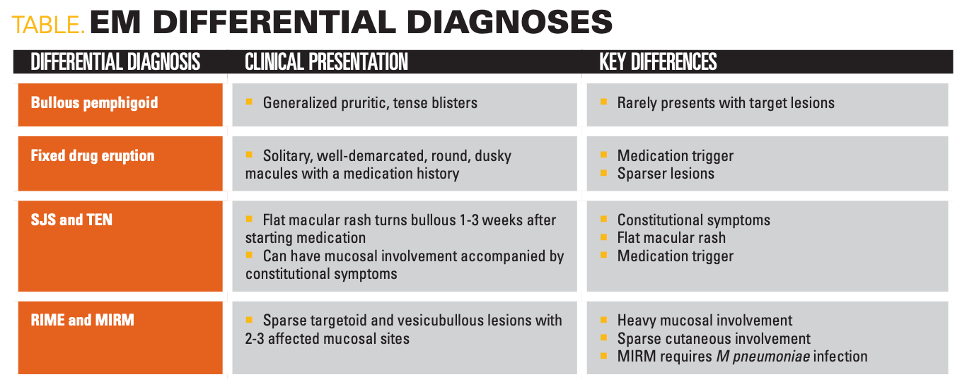 EM is diagnosed clinically, although a skin biopsy may help exclude other causes if the diagnosis is unclear (Table). EM may be confused with bullous pemphigoid or fixed drug eruption, although the distinct target lesions of EM help differentiate it.4 SJS and TEN may also present similarly, although they usually start with more purpuric macules that develop into blisters rather than papular, target-shaped lesions as in EM.5 Reactive infectious mucocutaneous eruption and Mycoplasma pneumoniae–induced rash and mucositis are also in the differential, but can be differentiated based on distribution, as they usually present with sparse cutaneous lesions on the extremities and trunk but heavy involvement of several mucosal sites.6