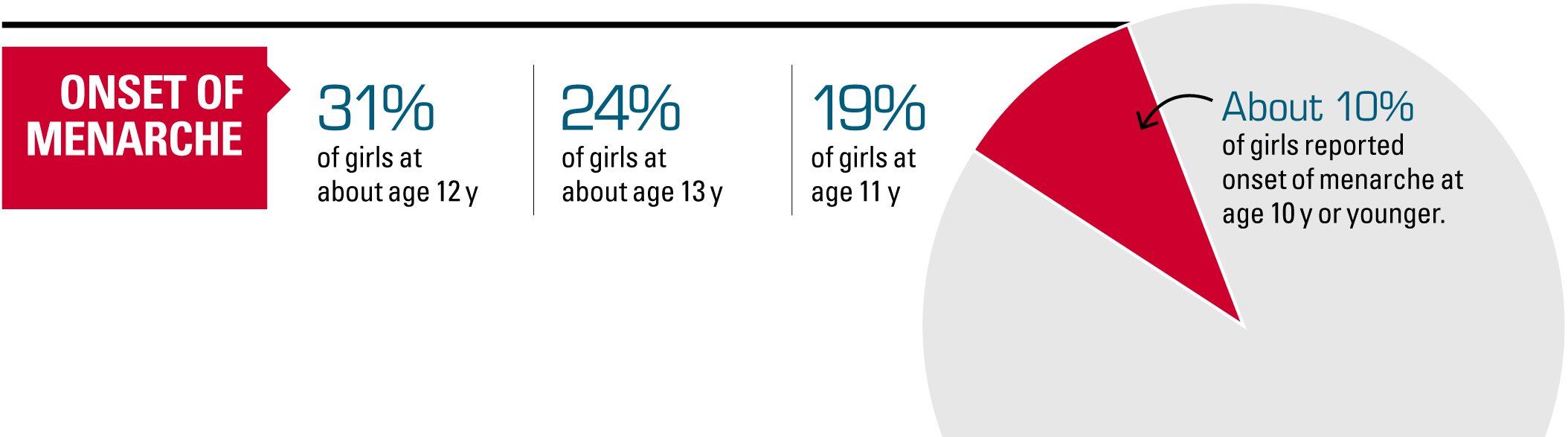 The study found that the onset of menarche was about 12 years for most of the girls (31%) followed by age 13 (24%) and age 11 (19%), but ranged from 7 to 24 years. About 10% of girls reported age of menarche at age 10 or younger.