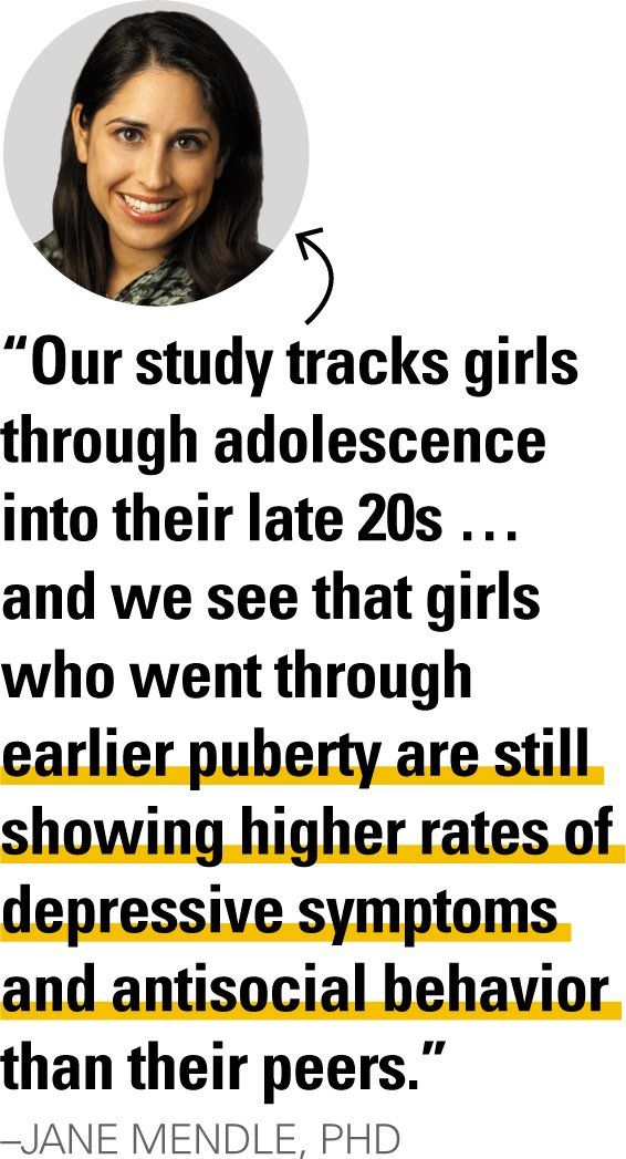 It is well known that early puberty in girls is associated with a myriad of psychosocial effects that make them vulnerable to depression and antisocial behavior during adolescence. Less known is how these effects play out over time and into adulthood.
