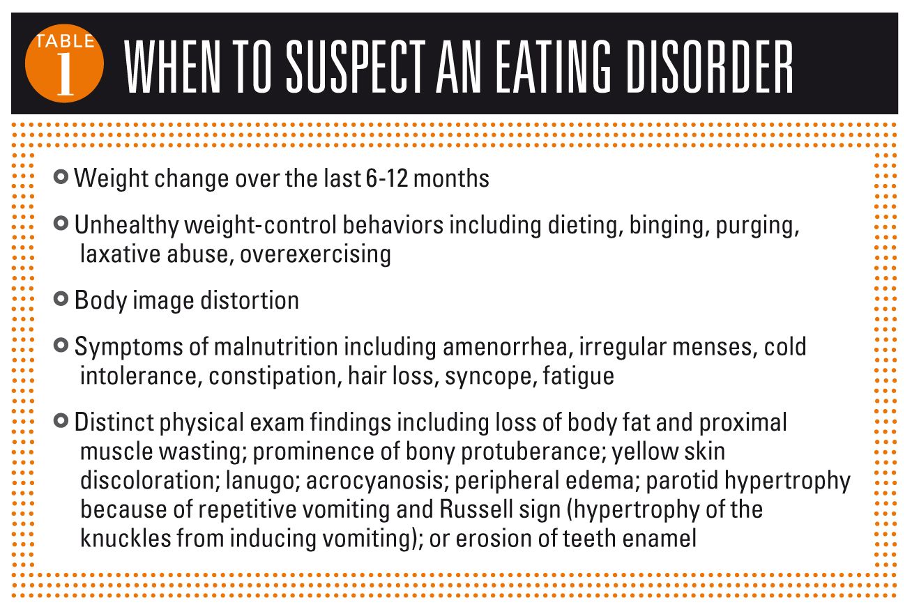 Children, adolescents, and young adults with eating disorders can present to the pediatrician with a variety of symptoms including weight loss, vomiting, growth retardation, pubertal delay, and amenorrhea. In an adolescent girl who has lost weight, is exercising excessively, or is engaging in unhealthy weight control behaviors, an eating disorder should be suspected. Management is best conducted by a multidisciplinary team. Weight restoration and resolution of the cognitive distortions regarding shape and weight are the main goals of treatment.