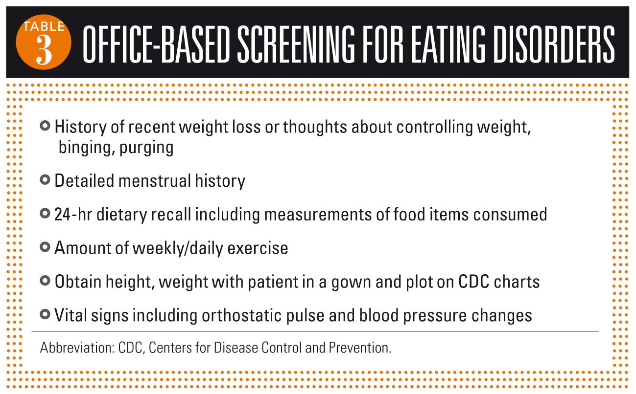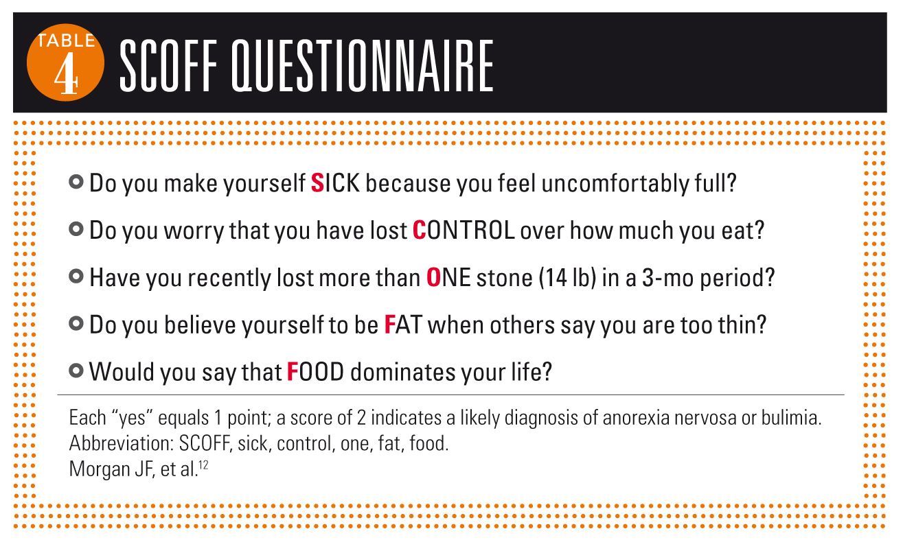 Strategies for office-based screening are outlined in Table 3. Screening tools are available for the pediatrician, for example the Eating Attitudes Test or the SCOFF (Sick, Control, One stone, Fat, Food) questionnaire (Table 4).11,12 Many practices and clinics employ confidential questionnaires that screen for a variety of risk and resilience behaviors, including questions related to eating disorders. For adolescents and young adults, it is important to interview the patient alone in addition to interviewing him/her with a parent. History should include questions about recent weight changes including maximum and minimum weight and weight at which menses were lost; changes in eating habits; and symptoms related to malnutrition. Other pertinent information should include a detailed menstrual history including confidential sexual history; a 24-hour dietary recall including measurements of food items consumed; and information on the amount, intensity, and duration of exercise. It is important to ask about preoccupation with shape and weight; distortion in body image; and binging or purging behaviors. Denial or secrecy is common, and frequently there are discrepancies between the history provided by the patient and that provided by a parent.