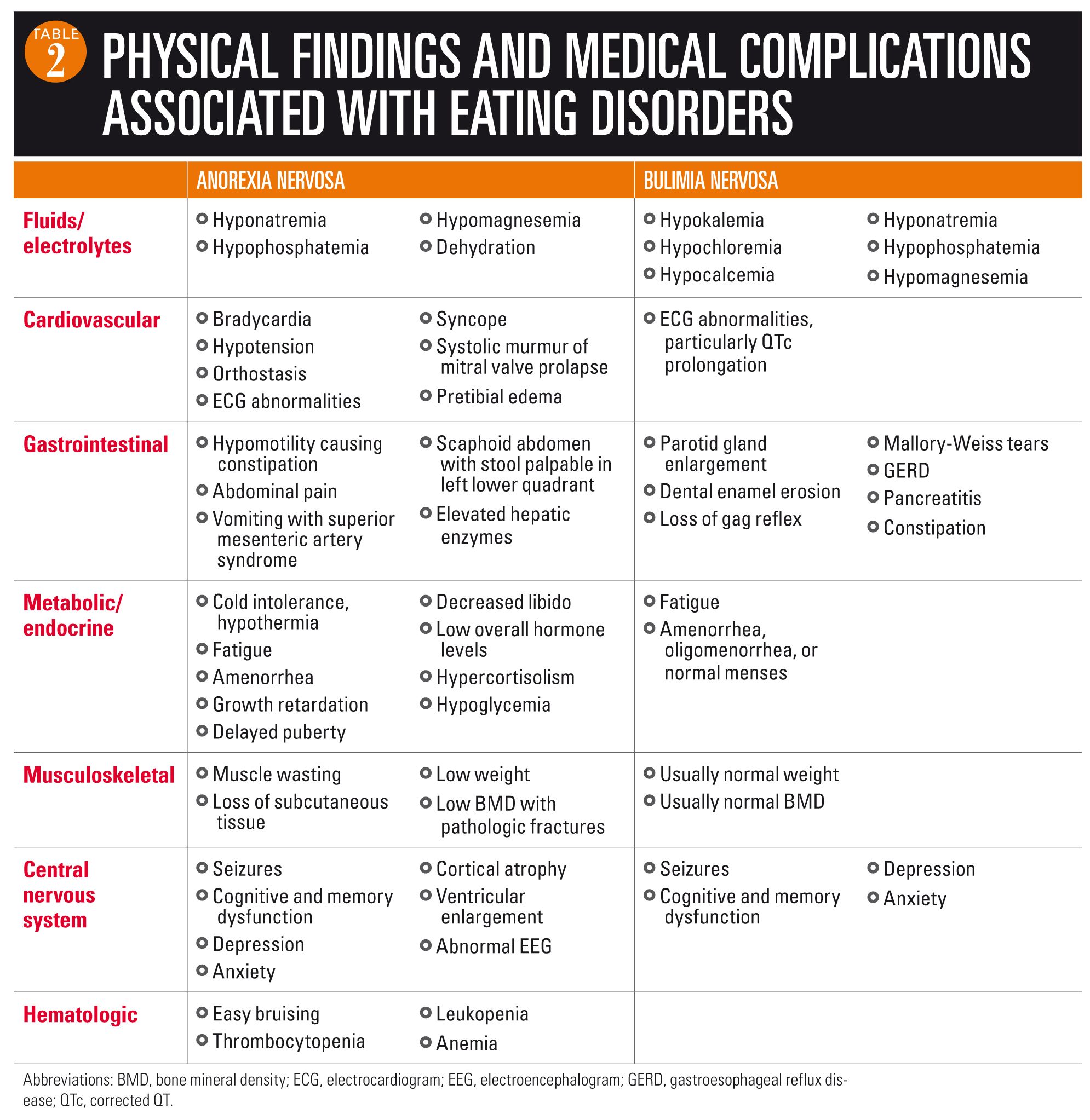 Typical presentations to the pediatrician are primarily related to weight-control behaviors (including food restriction, binging, purging, laxative abuse, and excessive exercise) and the effects of malnutrition (Tables 1, 2). A child or adolescent can present with failure to gain expected weight during a period of growth or may even present with frank growth retardation and pubertal delay. Female adolescents and young adults may present with primary or secondary amenorrhea.