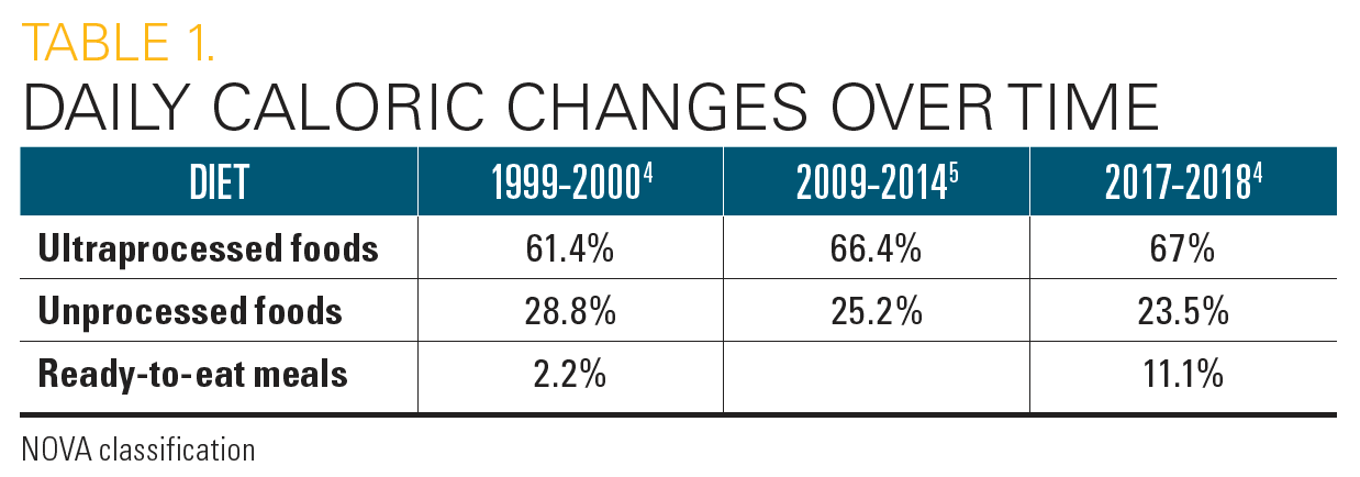 Historically, food was transformed for improved palatability, as well as preservation and storage.1 Foods have been processed to make them more appealing for both convenience and taste. Since the 1970s, ultraprocessed foods have been available in most of the world and over the past 20 years have become a major source of calories, comprising an average of 3 out of 5 calories consumed daily2-4 (Table 14,5). Ultraprocessed foods are easy to manufacture, which reduces industrial costs for companies.6 Food corporations have focused on advertising and marketing of these products to improve sales, but eating more ultraprocessed foods leads to a decline in dietary content of important vitamins, minerals, protein, and fiber.6,7