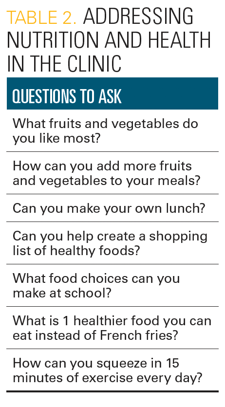 For clinicians, engaging with both parents and adolescents during visits creates an environment of shared decision-making, and motivational interviewing can lead to the most success for implementing dietary changes. Potential engaging questions that lead to action are included in Table 2. Utilizing a multidisciplinary approach, including access to behavioral psychologists and dietitians to help with decision-making and meal planning, also can be helpful.