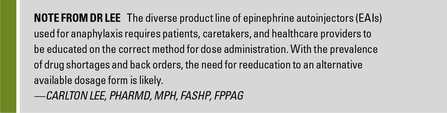 The preferred formulation of epinephrine for anaphylaxis is an autoinjector formulation3 because autoinjectors provide a premeasured packaged dose that requires no measurement or manipulation for dose accuracy. There are several of these epinephrine autoinjectors (EAIs) on the market and deciding on the optimal formulation for the patient presents its own challenges.