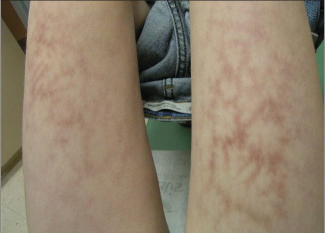 The father of a 10-year-old boy was concerned about the asymptomatic rash on his son’s anterior thighs that had persisted for 9 months. The macular, reticular, erythematous rash had