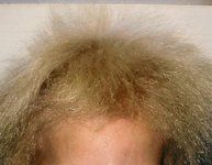 Uncombable hair syndrome (UHS), or "spun-glass hair," is characterized as frizzy, dry, silvery-blond to straw-colored hair that stands away from the scalp and is unable to be combed flat.1,2 Only scalp hair is affected, and eyelash, eyebrow, facial, and body hair is normal in appearance.3 The entire scalp typically is involved, but localized forms have occurred in some persons.1,3 A person's degree of disarray may be related to the number of hairs affected, and approximately 50% of hairs must be affected for clinical changes to become apparent. The quantity, fragility, and rate of hair growth are normal.3,4 The syndrome is not associated with any physical, mental, or neurologic abnormalities.1-5 UHS usually becomes evident between 3 months to 3 years of age but can present at any time from infancy to 12 years.1 It is rare, with fewer than 100 reported cases.
