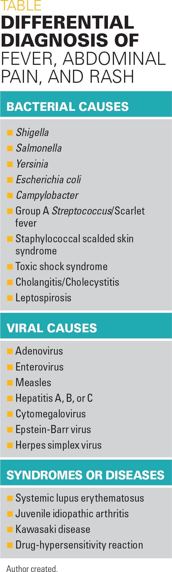 The patient was resuscitated with intravenous (IV) fluids and started on IV piperacillin and tazobactam empirically for systemic inflammatory response syndrome (SIRS) in the setting of bacteremia or viremia. Given his high fever and gastrointestinal (GI) symptoms of abdominal pain and diarrhea, his differential diagnosis included bacteria (such as Shigella, Salmonella, Yersinia, Escherichia coli, Campylobacter) and viruses (adenovirus, enterovirus, and hepatitis A, B, and C). Syndromes that could explain his high fever, abdominal pain, rash, and ocular symptoms also included autoimmune and vasculitis diseases. The Table provides the working differential diagnosis. The Pediatric Infectious Disease service was consulted.
