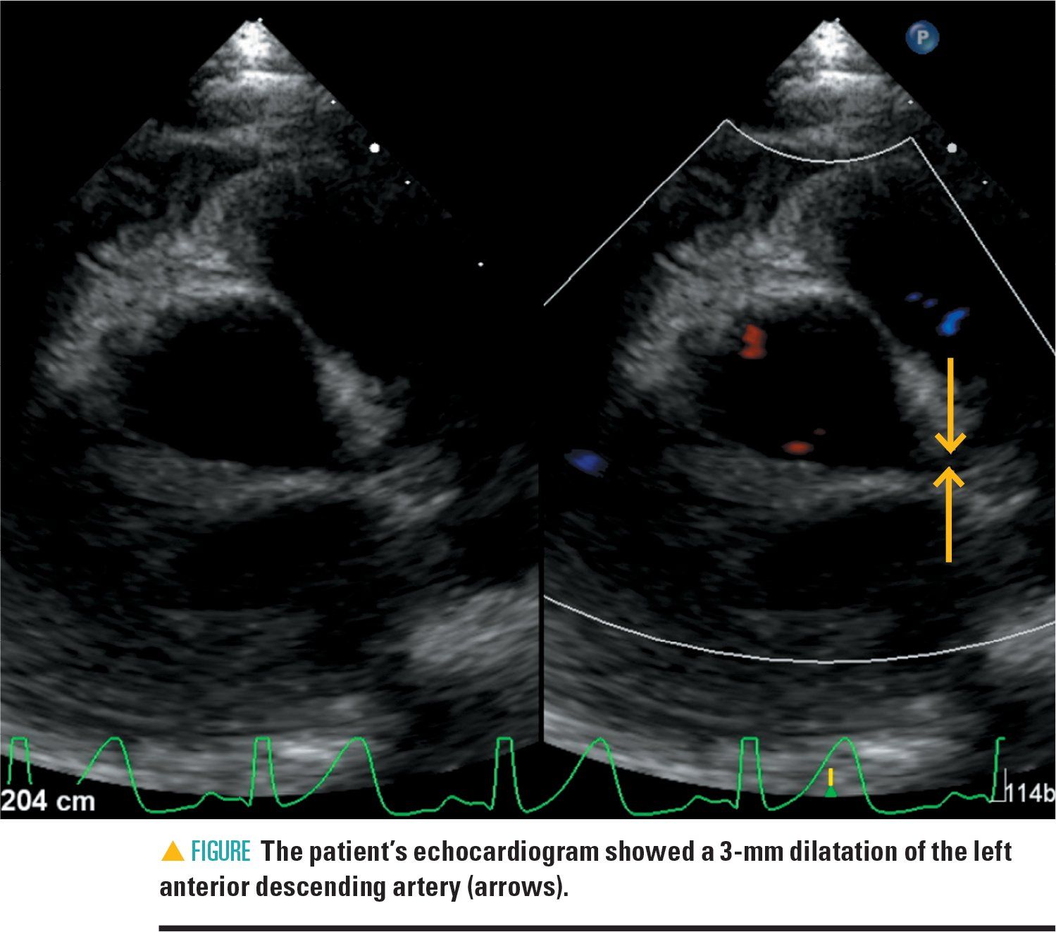 Patient's echocardiogram shows a 3-mm dilation of the left anterior descending artery
