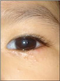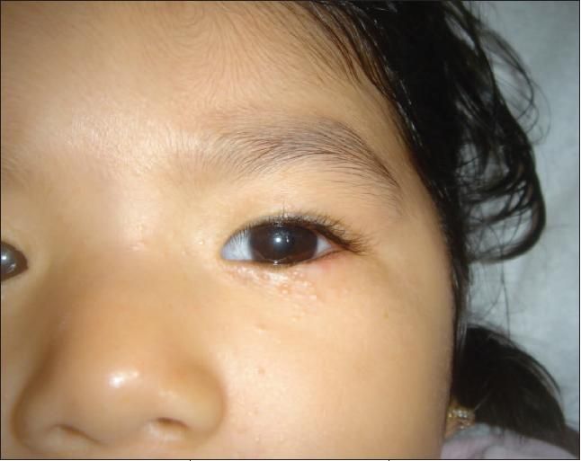 This girl was brought for evaluation of these "bumps" around her eyes. Her parents are concerned that the lesions will interfere with her vision.