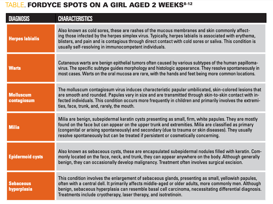 In addition to Fordyce spots, differential diagnoses include oral herpes, warts, molluscum, milia, epidermoid cysts, and sebaceous hyperplasia (Table).8-12