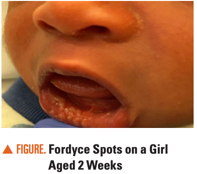 Fordyce spots represent benign, painless, visible, and ectopically located sebaceous glands not associated with hair follicles.1 They are uncommon in the first weeks of life. Although Fordyce spots may be present in up to 80% of adults,2 estimates suggest a prevalence of less than 5% in neonates.3,4 However, some studies show a much higher prevalence, such as 44% of 1000 Iranian neonates examined in a prospective cohort study.5