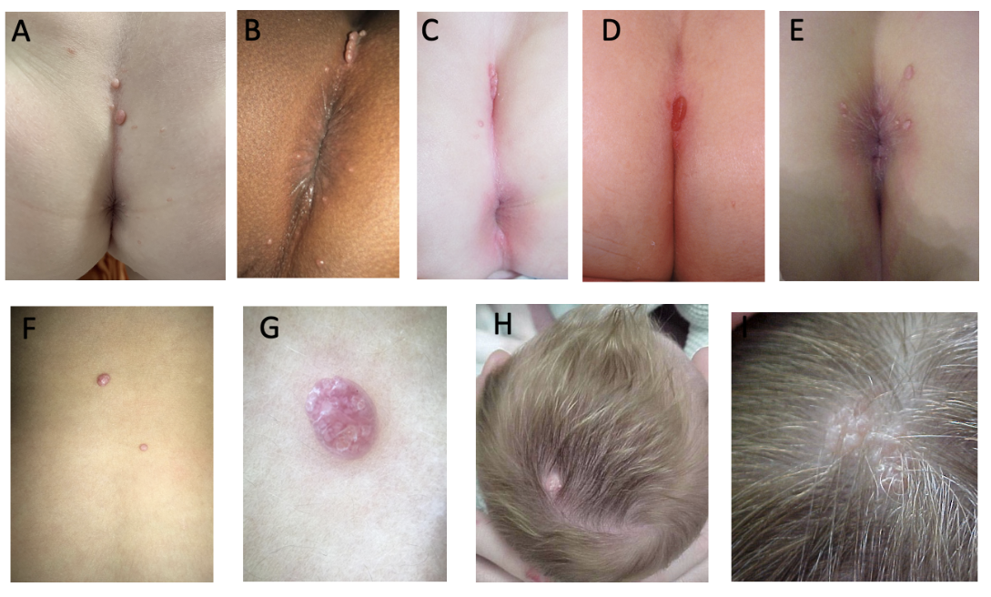 A) Present case B) “Kissing” perianal distribution with an agminated lesion at the superior aspect of the gluteal cleft C) Agminated lesion within the gluteal cleft, suggesting a midline congenital anomaly D) Gluteal cleft, congenital and isolated, suggesting occult spinal dysraphism E) Gluteal cleft, condyloma-like F) Achrocordon-like and agminated lesions, unmagnified G) Achrocordon-like agminated lesion, dermatoscopic view H) Congenital agminated (sine nevus sebaceous) I) Congenital agminated (sine nevus sebaceous)