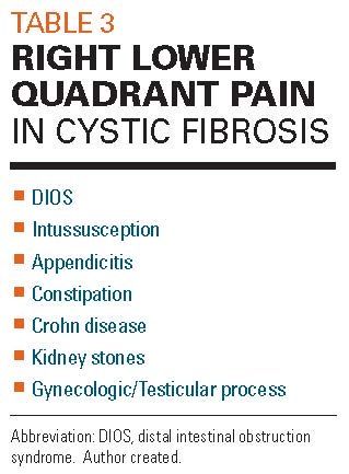 Right lower quadrant pain can be due to appendicitis, DIOS, intussusception, or Crohn disease, which is 17 times more prevalent in CF than the general population21 (Table 3). As in children without CF, intermittent abdominal pain can be due to undiagnosed malrotation with intermittent volvulus. In particular, infants with CF are at higher risk of volvulus in absence of malrotation due to inspissation of meconium. Fat malabsorption increases the risk of oxalate kidney stones.