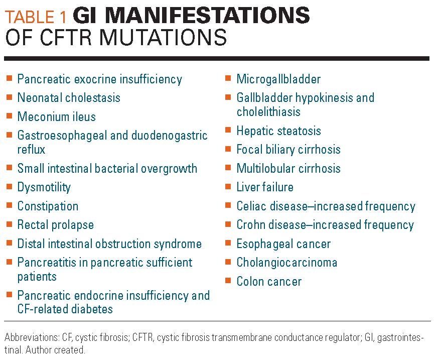 Cystic fibrosis (CF) is the most common lethal autosomal recessive disease in the United States, occurring in 2000 to 4000 newborns.1 It is caused by one of the more than 2000 mutations of the CF transmembrane conductance regulator (CFTR). Although most of its morbidity and mortality stems from pulmonary decline, it was first recognized in 1938 as a cause of severe failure to thrive in infants due to characteristic pancreatic insufficiency. Decades later, we are starting to understand the full implication of the effects CFTR mutations on the entirety of the gastrointestinal (GI) system (Table 1).