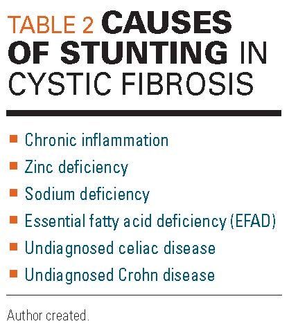 In addition to BMI, stunted height must be screened for, as height also correlates with lung function.5 There are multiple causes of stunting in CF (Table 2). A chronic inflammatory state makes insulin-like growth factor 1 (IGF1) less responsive to growth hormone. In addition, CF-related diabetes (CFRD), a unique form of diabetes specific to CF, can lead to growth failure.